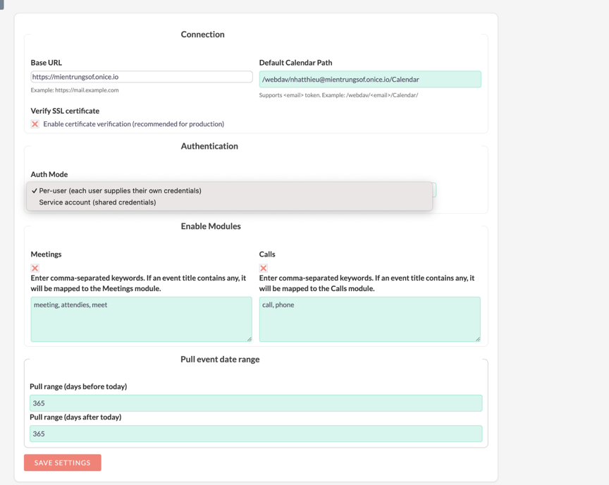 If you choose per-user authentication, each SuiteCRM user gets a small configuration panel in their profile:
